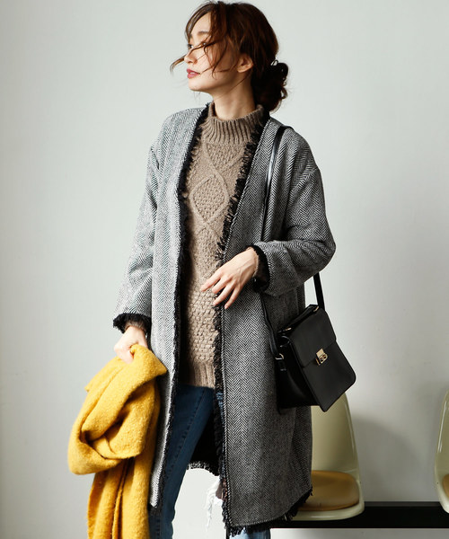 ツイードコートにフリンジが施された オリジナリティ溢れる1着。 トラッドな素材使いによるレディなアウターは 着るだけで大人っぽいスタイルが完成。 深めのVネックで今年らしさも取り入れたデザインが◎ ノーカラーでチラっと見えるインナーも オシャレ度アップ。 素材も高級感漂う上質なツイードをチョイス。 “上品なコートを着たいけど、普通じゃ物足りない” という方にオススメなジャケットです。 ◆素材 ツイード調のしっかりとした素材 伸縮性なし/透け感なし/裏地あり ◆ケア方法 ・お洗濯の際は手洗いをおすすめ致します。 ・アイロンをお使いの場合は中温でご使用ください。 ◆注意事項 *撮影場所やイメージにより 実際の商品と色味が若干異なる場合がございます。 商品のお色味はカラーバリエーション画像をご参照ください。