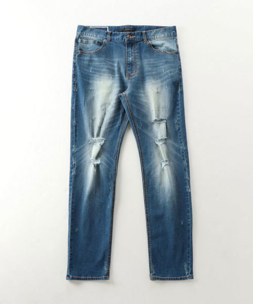 色落ちやクラッシュ加工にこだわったデニムスキニー!しっかりとストレッチが効いているため、スリムフィットでありながら動きやすさも両立しています。ひざを中心としたダメージは横糸残しの丁寧な加工、全体には細かくダメージ入れた抜群の加工感。いつものデニムスキニーもワンランク上に仕上がります。[クリーニング]洗濯機洗い可(弱く)