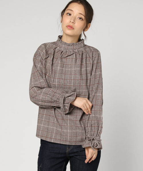 スタンドカラーやグレンチェック柄で、上品クラシカルな印象に仕上げたブラウスです。 ギャザーが作るふんわりとしたフレアカフもフェミニンな女性らしい着こなしを演出してくれます。 クリーンなルックスで合わせるテイストを問わず、デイリーカジュアルからオフィススタイルにと、幅広く活躍してくれるアイテム。