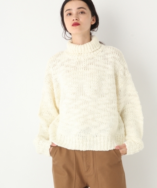 トレンドのざっくり感のあるローゲージニットが新着。 スラブ糸(撚りの強さの違いで、糸に細太の動きをつけた糸)で仕立てたラフな風合いに、 首元のゆるっとしたタートルネックや、程よく身幅のあるデザインで、リラックス感のあるカジュアルな1着になっています。