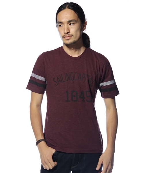 両袖にラインを、フロントにはナンバープリントを入れた プレッピーテイストのTシャツ。 バイオウォッシュを施す事で、 程良く着古した感じを演出しました。