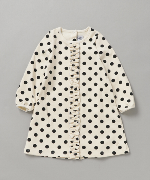 伸縮性のあるストレッチコットン素材を使用したワンピース。大きめのドットプリントがどこかレトロな印象です。シンプルなAラインのシルエットに、フロントにたっぷり施したフリルが華やかな印象。後ろはスナップボタンで裾まで全開するので、お着替えも簡単です。タートルネックボディとタイツを合わせれば、冬まで大活躍!