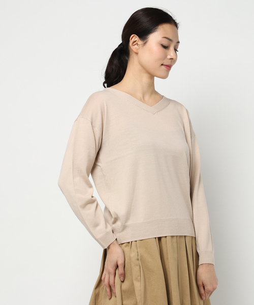 カシミヤ混素材なので肌触りがよく、着心地が良いのが魅力的なニット。 Vネックで顔まわりをスッキリさせているので、女性らしい表情を作ってくれます。 ミニマルなデザインで幅広いボトムに合わせられるため、色違いでオススメしたい1枚。 厚手のコートインにも着やすい厚さで、ロングシーズン着られるアイテムです。
