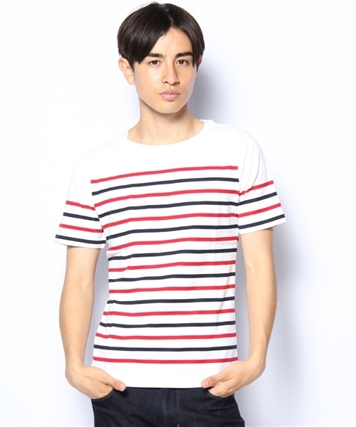 今年、外す事の出来ないトレンドのマリンスタイルには欠かせないボーダーTシャツです。ユニオンステーションでは差し色を効かせたボーダー柄の7分袖Tシャツを提案しています。胸元と袖をロールアップした際に見えるビビットカラーがスタイリングにアクセントを与えています。