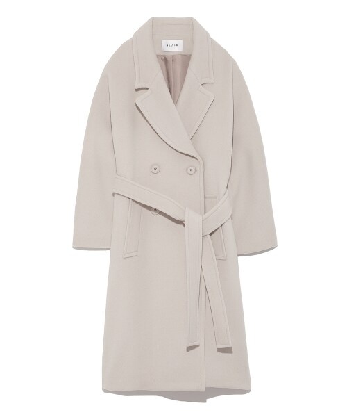 艶のある素材を使用した上品コート。クラシカルなダブル仕立ても、リボンベルトと女性らしいフレアシルエットでエレガントムード漂う仕上がりに。スタイリングを選ばず、オンにもオフにも活躍できる万能アウターです。※商品画像はサンプルのため、色味やサイズ等の仕様に変更がある場合がございますので、予めご了承ください。