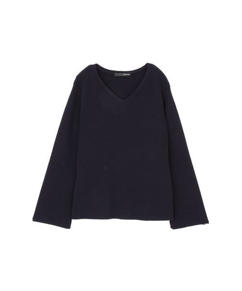 衿ぐりラインは編立衿でスッキリ仕上げています。身頃もミドルゲージの総針で大人っぽくシャープな仕上がりです。袖のAラインのスリットがデザインポイントです。