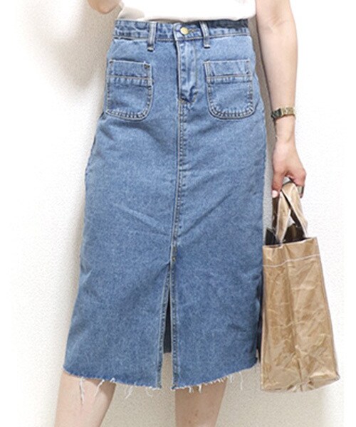 膝丈〜膝下丈で、フロントポケットとスリットがポイント。 裾はカットオフになっていて、シンプルながらオシャレ度の高いタイトスカート。 カジュアルコーデの定番アイテムとして、一年中お使いいただけます! 【サイズ】 表示サイズ F 実寸サイズ 着丈 約67cm ウエスト 約36cm ※平置きにて計測しております。