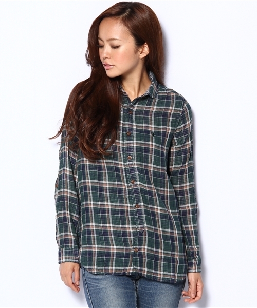 毎シーズン大好評で完売となっているダブルガーゼ素材の丸襟チェックシャツです。やわらかなガーゼ素材を2枚仕立てにすることで、ふんわりと温もりのある優しい着心地でご好評いただいております。表はチェック柄、裏はギンガムチェックで遊び心たっぷりのシャツとなっております。袖はロールアップ仕様でアレンジ可能となっておりますので、今からの晩夏コーディネートとしてカジュアルなスカートとの組み合わせがオススメです。中国製店頭にてお問い合わせの際は、下記の品番をお申し付けください。品名:ダブルガーゼ丸襟シャツ 品番:76106291051model:H160 B78 W59 H85 着用サイズ:MEDIUM