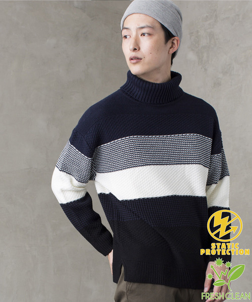 メランジ糸を使用して仕上げたタートルネックニット。配色を切替えたボーダーデザインが、手軽に着こなしのアクセントになります。 程よい厚みのニット素材で、リラックスして快適に着用頂けるひと品。カラーは季節感のあるワインを含めた4色展開でご用意致しました。定番のデザインは、シーズンをまたいで長くご愛用頂けます。 一枚で着用頂くのは勿論、インナーとしてのアクセント使いもオススメです。 【静電防止】 着脱の際、静電気を防止します。 【抗菌防臭】 優れた抗菌、防臭作用を備えた快適素材で、気になる臭いを抑えます。いつも爽やかな着心地を楽しめます。