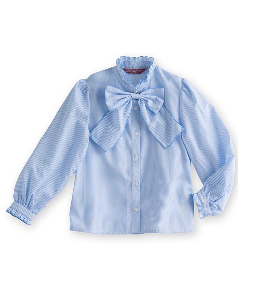 柄で楽しむ、ドレッシーなシャツブラウス スタンドカラーと袖口にあしらったフリルと、取り外し可能なリボンがドレッシーな一着。 白が圧倒的に多いキッズフォーマルの定番アイテム・シャツですが、 もっとおしゃれを楽しむために、定番の柄生地を使ってかわいらしいシャツを作りました。 入学式や卒業式などスーツに合わせて着ていただくと、 ジャケットからのぞく柄とリボンがスタイリッシュ。 また、無地のスカートと合わせるだけでキュートなフォーマルスタイルが完成するので、 発表会や親族の集まり、会食など、きちんと感が欲しい時にもおすすめです。 卒園式・入学式・演奏会や合唱コンクールにも◎ スーツやワンピース、スカートに合わせておしゃれにコーデ♪ チェックとストライプ、それぞれ2色ずつでご用意。柄で素材も異なります。 ◆STRIPE◆ 爽やかな雰囲気をまとう、×ホワイトのストライプ。 ポリエステル配合で、シワになりにくいのも嬉しいメリット! ポリエステル75%、綿25% ◆CHECK◆ 綿100%、こだわりの「先染めチェック」! 前立て部分はこだわりのバイヤス切替で、斜めチェックをアクセントに。 リボンブローチについて:安全ピンで取り外し可能 洗濯:洗濯機使用可(ネット使用) ※商品の素材や色合いなど、生産時期によって差異が生じます。