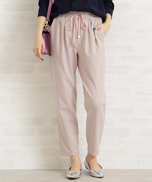 お馴染みデイリースタイルを大人カジュアルに仕上げるイージーテーパードパンツ。楽チンでいてキレイめを目指し、改良を重ねた美しいテーパードラインです。ストレッチ性があり動きやすく、型崩れしにくいきちんと感に加え、ソフトな肌触りと※吸湿発熱のある機能素材です。※汗などの水分を吸収して発熱する繊維。ウエストはゴム仕様なので、ストレスフリーな穿き心地に、調節できるウエストのリボンは、生地と同色なので大人見えします。Vネックなどの、女性らしいフォルムやヌケ感のある襟ぐりニットやブラウスを合わせ、今季らしいタックINしたコーディネートがお勧めです。※裏地無し