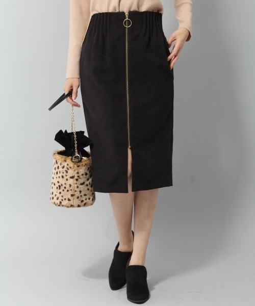 フロントのファスナーがスタイリングのポイントになるアイテム ウエストゴムでストレスフリーな着心地♪ タイトシルエットでオンにもオフにも着用できるスカートです。