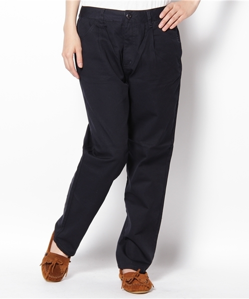 女性らしい形をした柔らかいチノパンツ。フロントにタックを施しており、生地に余裕を持たせているため立体的なデザインのパンツに。ウエストから足元にかけて少し絞り気味なシルエットです。ロールアップスタイルのも◎ウエスト裏側のネイティブ柄にも凝っていてCUTE♪ 店舗にてお問い合わせの際は、下記の品番をお申し付け下さい。 型番:DU11AW-2630-001 model:H168 B76 W63 H84 着用サイズ:SMALL