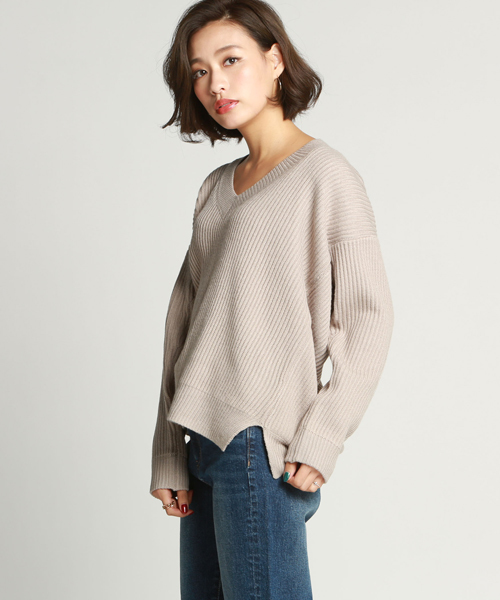 トレンドの抜け襟でざっくりとした編地がこなれ感のあるVネックニット。シンプルながらも今年らしさが垣間見れるニット♪ゆるっとしたオーバーサイズのシルエットでリラックス感たぷりの着こなしに。少し深めに開いたVネックは首周りをすっきりとみせてくれ女性らしさも◎。ボトムにフロントをインしたり、腕まくりをしたり、着こなしのスタイリングを楽しんで♪■モデル身長165cm