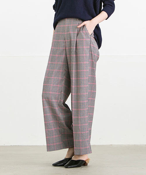 クラシカルな雰囲気漂うLIPSTARオリジナルのチェック柄パンツ。大きめのチェック柄に効いた差し色のラインがポイントに。季節感たっぷりの素材感とワイドなシルエットでトレンドコーデを盛り上げてくれます。後ろはゴム仕様なので、ストレスフリーな履き心地です。ざっくりニットと合わせればリラックスした大人のカジュアルコーデの完成!センタープレス入りでキレイコーデにも合わせやすいデザインです。同シリーズにスカート(6111-67103)があります。