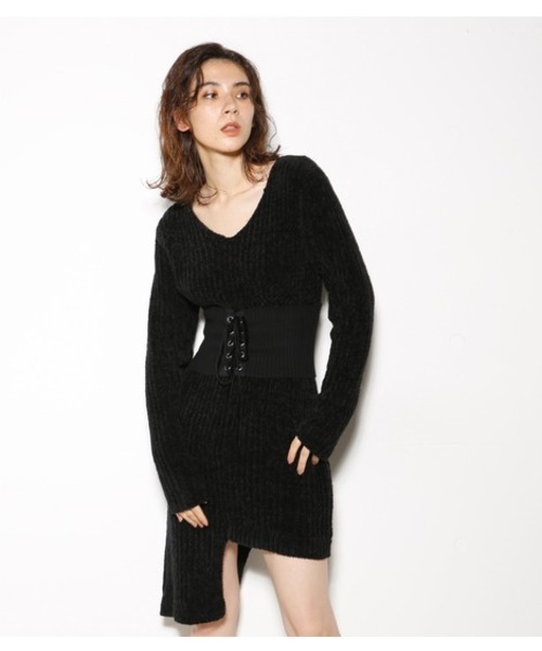 表面感のあるモール糸を使用したミドルゲージワンピース。裾はあえてアシンメトリーになっているので一枚ではもちろんスリムパンツを合わせても可愛い。