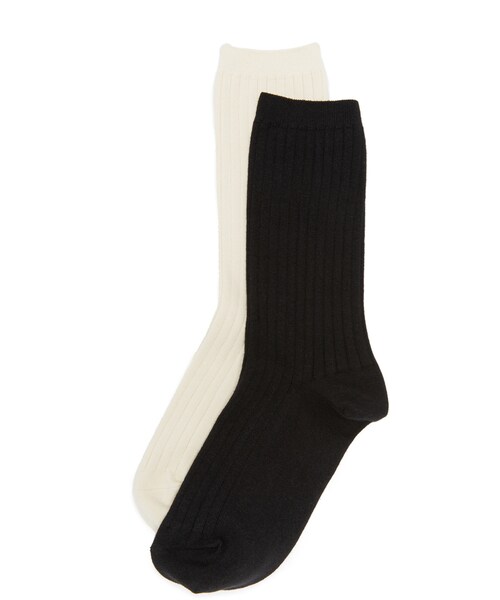 A two-pack of ribbed Madewell trouser socks in neutral colors. Fine-knit cuff. 78% cotton/19% polyester/3% elastane. Wash cold. Imported, Korea. Style # MADEW42554