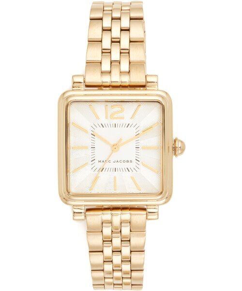 A classic, elegant Marc Jacobs watch with a square dial and minimalist markers. Spring-lock clasp. Water resistant to 50 meters. 2-year manufacturer warranty. Imported, China. Measurements Dial: 1.25in / 3cm Band: 0.5in / 1.5cm Length: 7.75in / 20cm Style # MJADB32020