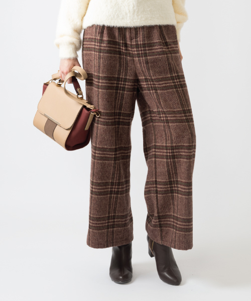 【暖かみのあるチェック素材ワイドパンツ】 引き続き人気のワイドパンツ。 チェック素材の新作が登場です。 少しのハイウエストで履き易く今季らしい印象のワイドパンツ。 程よくゆったりのサイズ感が色々なスタイルに合わせやすく いつものコーデにプラスするだけで旬なコーデの完成です。 落ち着いた暖かみのある柄感がトップスを選ばずに 着ていただけます。 マニッシュなシューズと合わせてトレンドっぽくコーデしたり パンプスでクールなきれい目スタイルもおススメです。 洗濯:ドライクリーニング 裏地有りです。 ウエストゴム有りです。