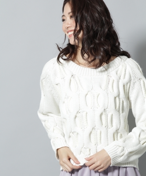 ざっくり編まれた大き目のケーブルが冬らしい温か味を感じるニットです。 ゆるっと少しオーバーサイズ目なのでボトムはスッキリにするとバランス◎ 天幅広めなので肩を落としてきても♪
