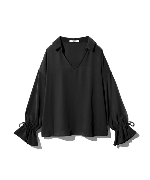 ドロップショルダーにし、ゆったりとしたシルエットで大人のこなれ感たっぷりに仕上げたシャツ♪ 女性らしい抜けを醸し出す、スキッパ―カラーが魅力的♂ きゅっと結んだ袖のフレアデザインが旬なスタイリングへと導くカギ!!