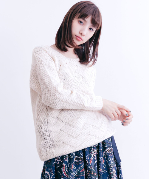 まえ身頃にざっくりしたケーブル編みのデザインがアクセントのニットプルオーバーです。袖部分はすっきりとしたサイズ感なのでコートなどの下にも合わせやすい1着です。