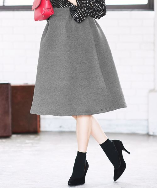 ボリュームのあるフレアラインが大人可愛いボンディングスカート。上品なひざ丈で、履くだけで女性らしさを引き出してくれます。【素材・サイズ感】 ハリ感のあるボンディング素材を使用。ウエスト部分はバックゴム仕様で、着脱がしやすいのが嬉しいポイント。厚みのある素材なので冬でも着こなして頂けます。 【スタイリング】 袖コンシャスなブラウスやニットを合わせた大人カジュアルな着こなしがオススメ。パンプス×靴下との相性◎