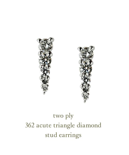 「 Acute Triangle Diamond 」 鋭角三角形ダイヤモンド 5石のダイヤモンド(約0.12ct)がキラキラと輝きます。 直線的なデザインで、クールな印象で身に付けて頂けるスタッドピアスです。 きちんとしたスタイルや、大人カジュアルスタイルにも良く映える華奢ピアスです。 ご自身へのご褒美に、そしてプレゼントにもお薦めのスタッド ピアスです。 18金ホワイトゴールド製