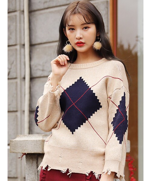 柔らかいタッチ感の厚さある素材感が素敵な ニットプルオーバーをご紹介! 大きなアーガイルパターンで、 裾周囲と袖のダメージポイントが魅力。 存在感がたっぷりなパターンと 配色が何よりも魅力ポイントです! 伸縮性のある素材で負担感も 一切ないのがうれしい一着に。