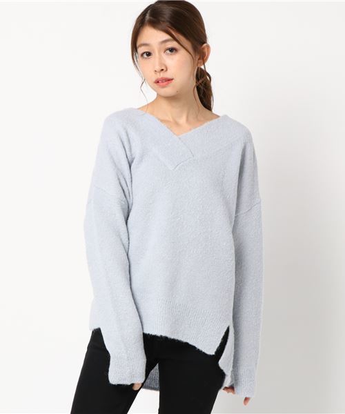 フロントとバックともにVネックでヘルシーな肌見せで抜け感のあるニットプルオーバー。柔らかな肌触りのブークレ素材はついつい触りたくなる心地よさ。ふんわりとしたシルエットがフェミニンで、大人可愛い雰囲気を演出します。お尻まわりもさり気なく隠すゆったりシルエットも寒い冬に嬉しいポイント。深めのVネックはネックレスやチョーカーがよく合います。