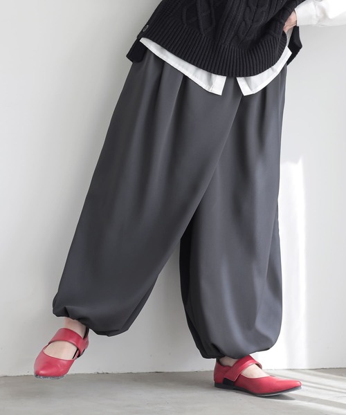 あの大人気のパンツが待望の復活!★お客様のお声にお応えして、ブラックとチャコールの2色が再登場★ n'OrLABEL アラビアンモードワイドパンツ。“絶妙なゆるシルエットで差をつける1本”Aラインのアラビアンシルエットと程よいゆるっと感を両立し、自然なこなれ感を演出。左ウエストから右裾にかけて施した深めのタックが視線を集め、裾はゴム仕様でモードなラインをつくります。“しなやかで柔らかい着心地”ほんのり光沢を帯びた上品な生地と、さらっと心地よい肌触り。落ち感が出るけれど薄すぎずしっかりした厚みで、ロングシーズン使える素材感。春〜秋はもちろん、重ね着次第で冬にも活用可能です。“インしても映えるウエストデザイン”広めのウエストベルトでトップスをインしても美しく決まるデザイン。ウエスト後ろはゴム仕様でストレスフリーな穿き心地も魅力。<SIZE>【フリーサイズ】ウエスト:68~110cmヒップ:120cmわたり幅:48cm股上(前):35.5cm股上(後):48.5cm股下:67cm裾周り:26~74cm総丈:96cmウエストゴム幅:7.5cm.........................................................................................................n'OrLABEL“ほかにない、私のデイリーウェア”毎日の生活を心地よく自分らしく過ごすための服。遊び心を取り入れた、大人のカジュアルスタイル。.........................................................................................................