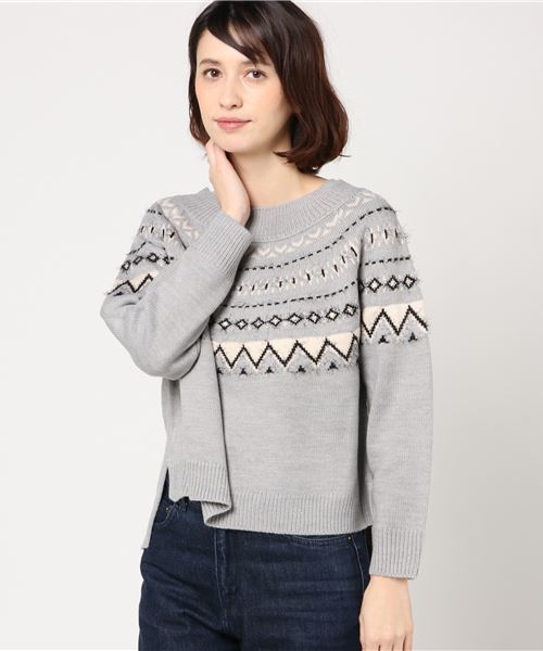 ふわふわとした毛羽感のあるノルディック柄デザインで、モダンな雰囲気に仕上げたニットプルオーバー。ラウンドネックや前後差をつけたヘムシルエットがヌケ感をプラスするポイントに◎落ち着いた色合いでコーディネートに品よく馴染み、デイリーに幅広く活躍してくれるアイテムです。