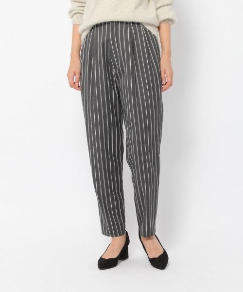 腰回りにほんのりゆとりをもたせたペグトップパンツ。美脚にみえるように追及されたシルエットが魅力。ウエストサイドにサイズが調整できるようにタブが付いています。ピッチの違う3種類の素材を使用した柄違いの展開は幅広いコーディネートに対応。ハイウエストなので、トップスをゆるくINするスタイリングもおすすめです。