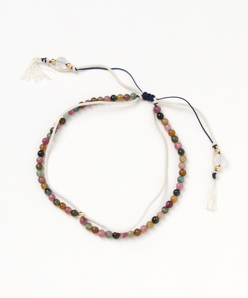 程良いしなやかさと艶のある光沢感が魅力の絹紐・京都組紐と、10月の産石・トルマリンを組み合わせたカジュアルで上品なアンクレット。左右に紐を引くとサイズ調整できます。ご自身用にはもちろん、ギフトにもおすすめのアクセサリーです。 産石(うぶいし)・誕生石 自分の生まれた月の石(産石)や、毎月の産石を身に付けることで守護され、幸運が訪れると云われています。 10月の誕生石 : トルマリン<電気石> 心痛解消・感受性増幅 岩座 - IWAKURA - 「日本の美しい心」「祈り」をテーマに、雑貨と天然石アクセサリーを展開するブランド。 心洗われる日本らしいデザインの商品を揃え、日本人の心のあり方と新しい御守を提案いたします。 ※こちらの商品は1点1点職人による手作りとなります。また天然素材を使用しております為、形や色合いなど若干異なる場合がございます。あらかじめご了承ください。 Amina Collection Co.,LTD.