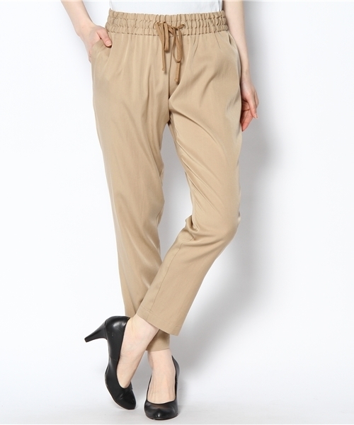 大人のリラックスムード漂う、キレイめパンツが登場です。柔らかさと張り感が程よくマッチした混紡素材を使用。艶のある表情がエレガントなドロストパンツです。ウエスト部分にあしらわれた細かなステッチが、美しいシャーリングを生み出し、お腹周りをスッキリカバー!裾に向かって細くなったシルエットは、美脚効果をもたらします!!オフィスにはジャケットやブラウスでコンパクトにまとめて。オフにはオーバーサイズのトップスでスタイリッシュに合わせて、あくまで大人らしさをアピール!楽チンにオシャレが楽しめる一枚です。 原産国:日本 モデル着用サイズ:36 model:H163 B80 W58 H84 店舗へお問い合わせの際は下記品番をお伝えください。 品番:68-23-0270-528