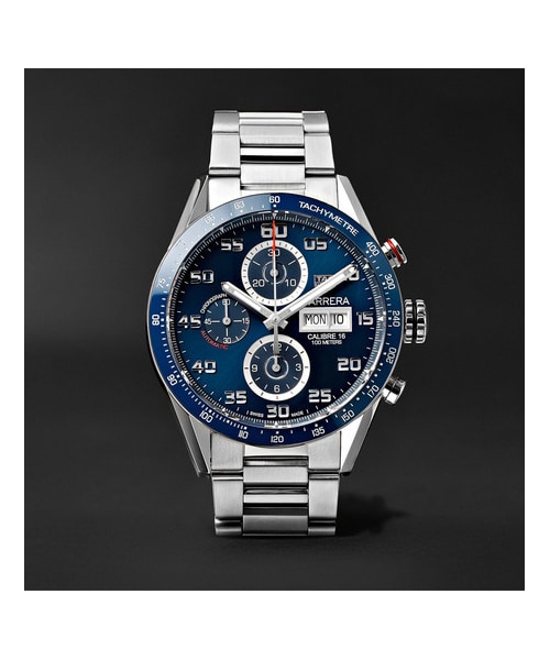 TAG Heuer 's 'Carrera' collection debuted in 1963 in homage to Mexico's daring La Carrera Panamericana race. This chronograph is powered by an automatic calibre 16 movement that's visible through the sapphire crystal caseback. Housed in a polished-steel case, it has a blue sunray-brushed dial finished with hand-applied indexes and luminescent hour and minute hands. We offer a two year warranty for all working parts and any manufacturing faults. - tMovement - Swiss-made automatic TAG Heuer Calibre Heuer 16 movement with 42-hour power reserve and rapid date correction - 21 jewels, 4 Hz/ 28, 800 Vph tFunctions - Hour, minute and second hands - Date window - Chronograph stopwatch with second hand and 30-minute and 12-hour sub-dials tDial - Blue sunray-brushed dial, rhodium-plated indexes and white SuperLumiNova®-coated hands - Blue ceramic polished tachymeter fixed bezel tCase - Polished-steel case - Domed, anti-reflective sapphire crystal lens and caseback - Polished-steel standard crown - Clasp-fastening steel strap tSpecifications - Case diameter: 43mm - Water resistance: 10 bar - Comes in a presentation box - Reference number: CV2A1V.BA0738 - Manufactured in Switzerland
