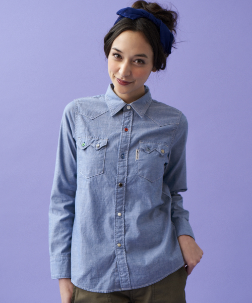 ■『BLUE BLUE』×『green label relaxing』 大好評いただいた2011秋冬に引き続き、2012春夏も聖林公司(HOLLYWOOD RANCH MARKET)のオリジナルブランドである『BLUE BLUE』と『green label relaxing』が、ダブルネームで商品を展開いたします。 今回のコンセプトも、『シンプル』と『Made in Japan』。前シーズン大好評頂いたウエスタンシャツの新作です。今回は軽やかなシャンブレー素材で、可愛らしいマルチカラーや様々な形のドットボタンが付いております!羽織りとしての着用もOKなので、カジュアルスタイルを楽しみたい方に大変おススメです。※こちらの商品には、この企画の為に作成した『BLUE BLUE』のオリジナルバンダナ(ピンクorグリーン)が付いております。ネットでのご購入の際は、カラーはお選びいただけません。予めご了承くださいませ。モデル身長:171cm 着用サイズ:FREE店舗にお問い合わせの際は下記品番をお申し付け下さい。品番:3611-599-0318
