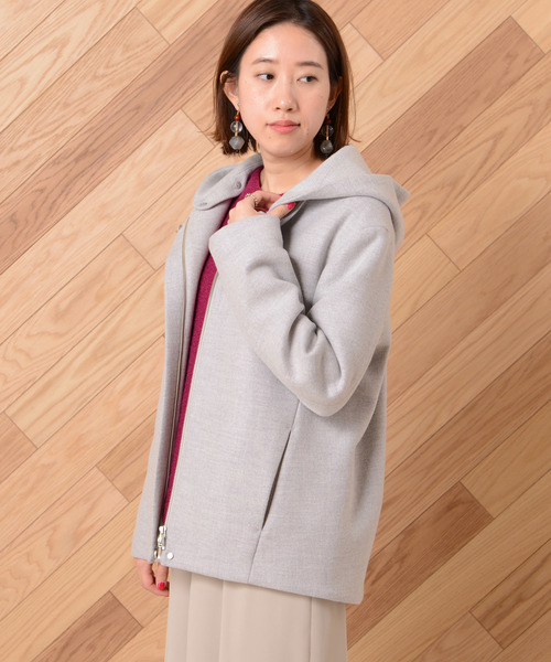 上質で滑らかな素材を使用したショート丈のフードコート。 フロント部分はジップ仕様の比翼仕立てで、風を通さずとても暖かです。 フードは取り外しができるので、ラウンドネックにも早変わり。一枚二役が嬉しいポイント。 シンプルで上品な佇まいが魅力の一着です。