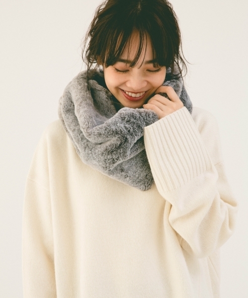 肌さわりの気持ちいいフェイクファー素材で仕立てたスヌードです。毛足に向けて色が薄くなる本物っぽいグラデーションカラーがポイント、シンプルで使いやすいワンツイストのデザインと、ボリューム感がリッチな印象です。今年人気のノーカラーコートと相性がいいのでオススメです。