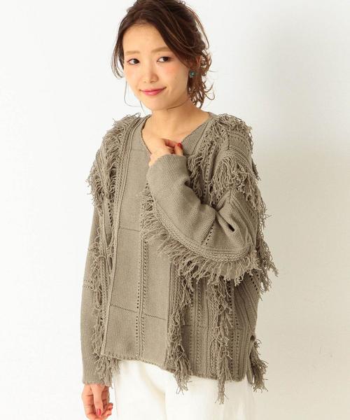 フリンジアイレットニット☆程良くルーズな着こなしが楽しめるニットは、フリンジで立体感を加え更に、アイレットワークで新鮮なデザインに仕上げました。トレンドのVネックでスッキリとしたシルエットにバックの裾を長めにしたりと、細部のディティールにまでこだわった一枚です。ワイドパンツやボーイフレンドデニムなどに合わせたリラックス感のあるスタイリングがオススメです。※着用、お取り扱いの際は商品についておりますアテンションタグ、洗濯ネームを必ずご確認ください。アウトレット商品のご説明 ・お買上頂く全ての商品を発送前に規定の検品を実施しています。 アウトレット商品につきましては包装やパッケージに破損・汚れが見られる 場合にも商品に欠陥が認められない際にはそのままの状態でお送り致します。 ・注文取消し・返品・交換対象外商品となっております。 ・お取り寄せ・ご試着対象外商品となっております。