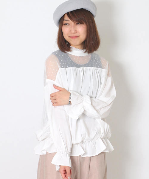 デコルテの透けるチュール切り替えやスタンドネックなど、レトロ気分の詰まったブラウス。トレンドのチェックパンツなどとも相性が良く、ニットの下に着て、首元からフリルをチラ見せするレイヤリングも人気です♪袖口&ウエストのゴムシャーリングは、くしゅっとブラウジングしても可愛く着て頂けます。[クリーニング]手洗い可ドライクリーニング可(P)ウェットクリーニング(W)
