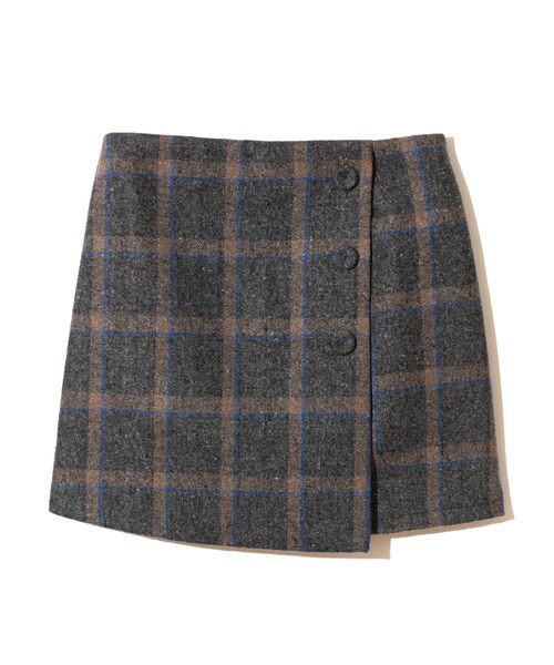 トレンドのラップスカートにチェック柄が登場♪ レッグラインをすっきりとキレイに見せてくれるショート丈が魅力的なアイテム♂ 無地のトップスを合わせて、上下バランス良くコーディネートすると◎ ★インパン裏地付きです。 ★裁断の関係で、柄の出方が写真と多少異なる場合があります。