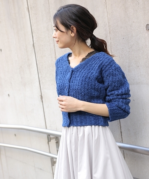 毛足の長いフェザーヤーンとは異なり、生地の糸に短い毛足が撚糸された特殊なフェザーヤーンを使用したショートカーデです。 ボタンをしめてプルオーバー感覚でショートトップスとしての着用がオススメです。 ハイウエストボトムとの相性はもちろん、フレアスカートとの合わせもぐっと重心が上がりスタイルアップも叶います。 柔らかい肌触りの為、薄手のインナー合わせで春のワードローブも見越してお使いいただけます。