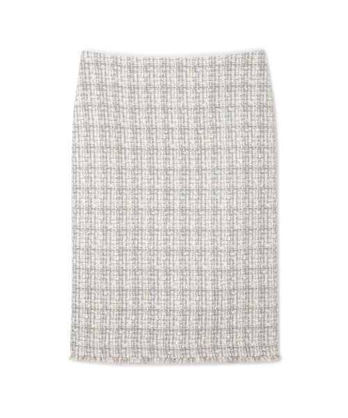 オリジナル柄のジャガードスカート裾にフリンジがついていることにより、華やかな印象に。同素材のジャケットとセットアップで合わせ、インナーにはボウタイ風ブラウソーがお勧めです。程よく厚手のの素材の為、下着のラインも気になさらずに着用出来ます。昨年からバージョンアップしたツイードスカートです。オケージョンにお勧めです。 ファスナー有り。 裏地有り。