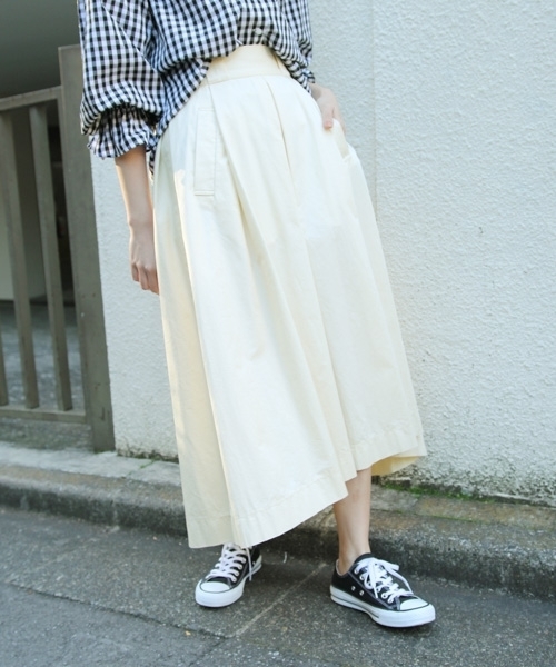 今季マストのチノボトム。 ウエストのタック使いとAラインシルエットがきれいなロングスカートです。 程よいボリューム感なので、ゆるっとしたビッグシルエットのスウェットやトレーナーでもバランス良く着ていただけます!ドットやギンガムチェック、ボーダーなど柄物との相性もバツグン◎アウターはGジャンやMA1、靴はスニーカーでカジュアルに合わせるのがおすすめ。