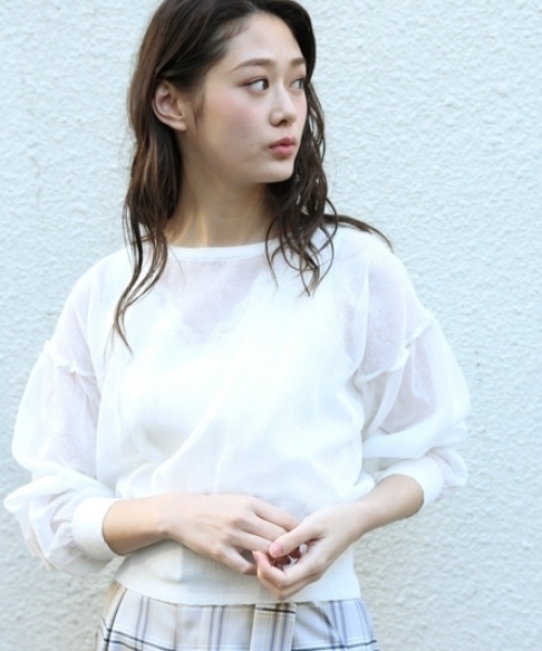 透け感が今年らしいトレンドライクなニットプルオーバー。この春注目の「シアー素材」をさりげなく取り入れるならこれ!透け感を生かして、インナーによってさまざまな表情が楽しめます。何にでも合わせやすいコンパクトな丈感もポイント。メインで着るのはもちろん、ジャンスカやビスチェのINに着てもOK◎チノやドットのボトムと合わせれば、一気に今年らしいコーデが完成します♪《プレスひねちおすすめCOORDINATE》「この春のジャンスカにINするならシアー素材が◎。透け感で子供っぽくならずにまとまりますよ。私はホワイト×デニムで合わせましたが、ブラック×白ジャンスカもおすすめです!」