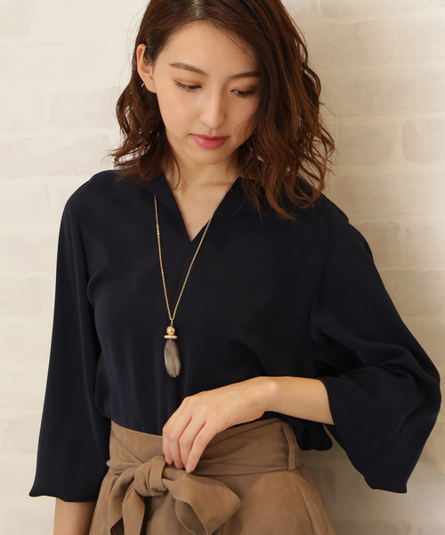 洗練感のあるジョーゼットブラウス。透けにくい合繊素材使用し、すっきり開いたオープンカラーも落ち着いた印象です。少し肩がドロップしたフォルムシルエットが、大人の女性に合うヌケ感のあるデザイン。裾の差丈やスリットでタックインしやすく、動きやすさもあります。通勤styleはもちろん、カジュアルボトムス合わせでトレンドスタイリングにもお勧めです。