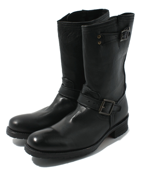 NUBUCK(=牛・羊などの表皮を削って毛羽立たせ、ビロードのような質感をもたせた革素材。) エンジニアブーツ(=靴紐は、作業者が足下のモノに紐を引っ掛ける恐れがあるため除外され、替わりにベルトが甲からくるぶしあたりに ついている。ベルトにはバックルが足の外側に配置され、ベルト長を調整できるようにしている。) 細部にまで拘りをみせたエンジニアブーツです。。 goaらしい加工も施されヌバック仕様が一段と味のある風合いを出している。