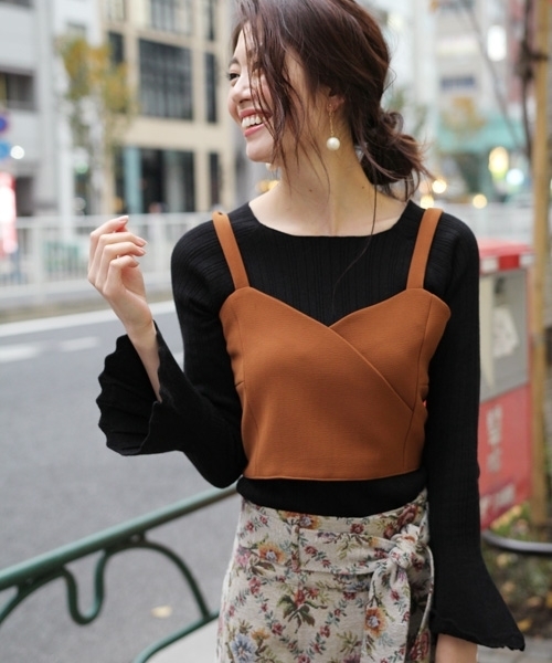 ニットとビスチェのセットアイテム! それぞれ別々にも使えるので、着回しの幅が広がるアイテムです。 ボトム次第で、カジュアルにもきれいめにもスタイリングできます♪ 袖フレアーがポイントのリブニットはビスチェなしでも〇