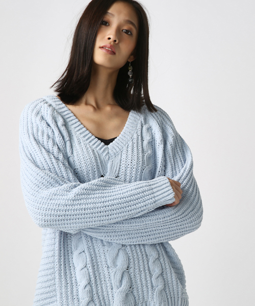 ふっくらとしたモール糸でざっくりと編み上げた長袖ニットプルオーバー。前身頃のみをケーブル柄で切り替え、着映えをアップさせています。肩のラインが気にならないラグランスリーブ、広めのVネックで添えた軽快な抜け感にも注目。優しい色味のカラーバリエーションからお好みをチョイスして。